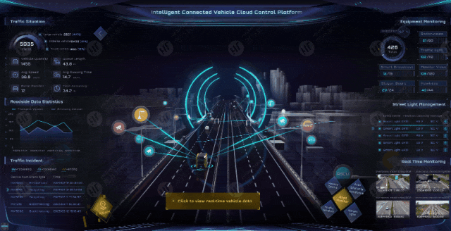 可视化大屏结合 GIS 地图,辅以左右两侧面板进行展示,展示了数据平台运行状态、交通流量趋势、重要拥堵和警情指数、路网信息等,智能网联汽车云控平台借助图扑 HT 丰富多样的图表、图形以及设计元素,把相对复杂、抽象的数据转化为可视化形式,以更直观、易于理解的方式呈现出来。