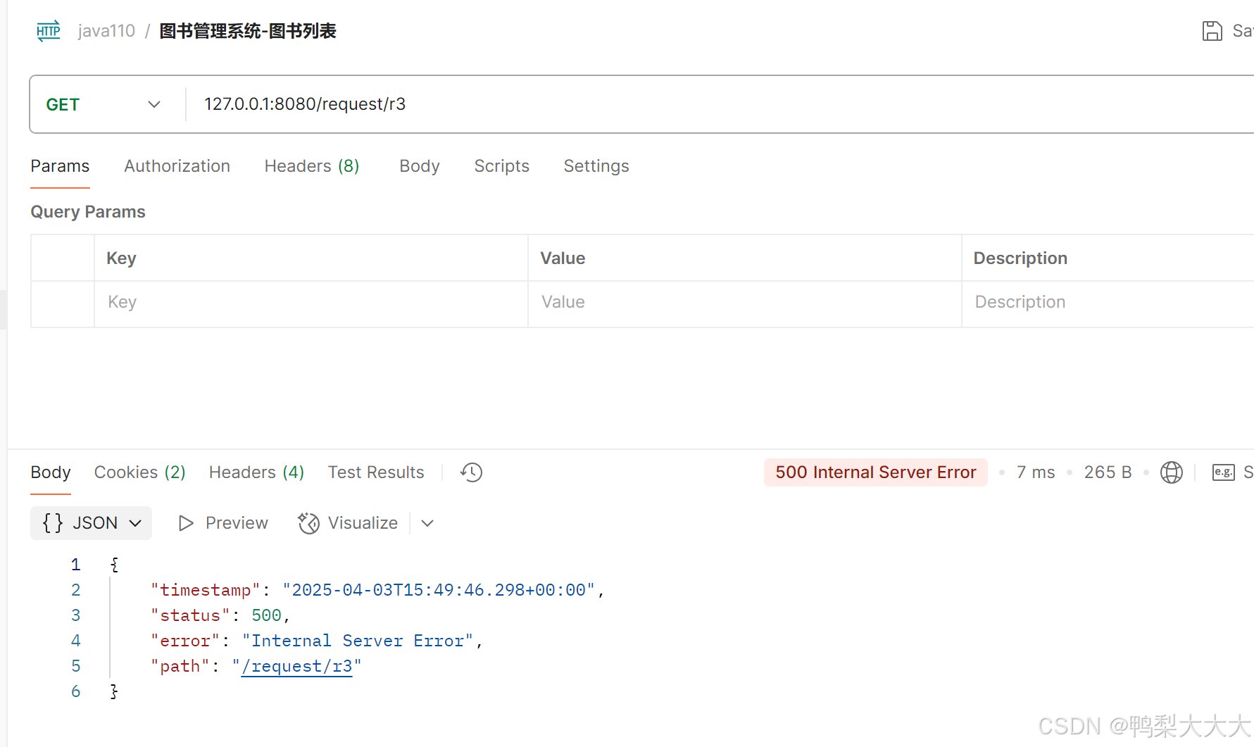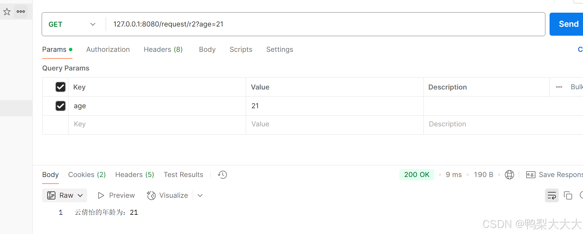 如上图所示,当路径变为127.0.0.1:8080/test/hello,即能正确访问到后端的代码。是由于我们在之前的代码的基础上给类加了一个**@RequestMapping("/test")。**所以要先访问类的路径,再访问方法的路径。