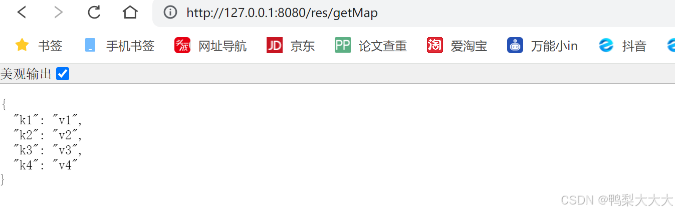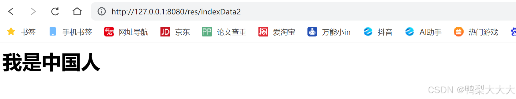 注:我们这里的注解由原来的**@RestController** 变为**@Controller**,那如果我们依旧选择之前的注释@RestController,看一个能不能显示这个前端页面。结果展示: