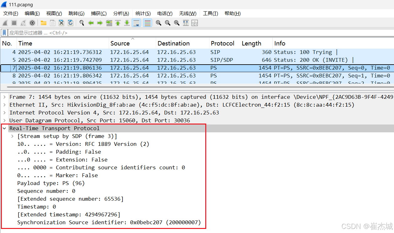 选中其中一个RTP数据包(RTP packet),下图红框中显示的就是其RTP header(关于RTP header的格式可以参考:《音视频入门基础:RTP专题(7)------RTP协议简介》)。可以看到该RTP数据包的RTP header的payload type值为96,为动态(dynamic)PT值。该值跟SDP描述中的PT值对应。所以可以确定其RTP payload中存放的是PS,即MPEG2-PS格式的数据:
