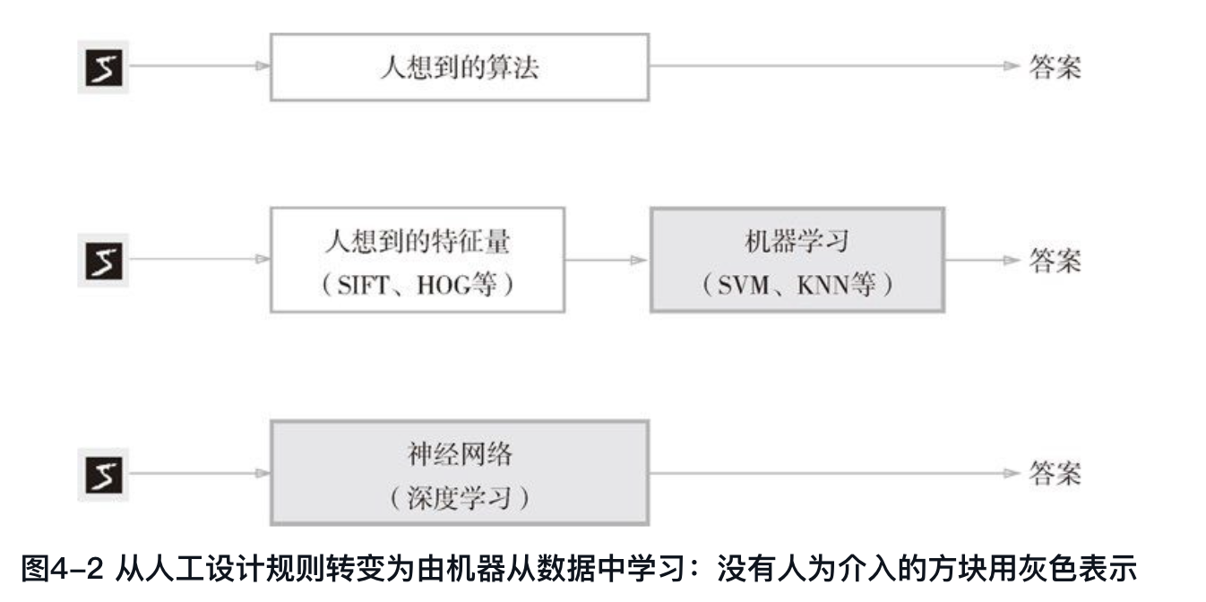- 深度学习:比机器学习更加避免人为介入,又称为"端到端学习",也就是从原始数据(输入)获取到目标结果(输出)的意思。