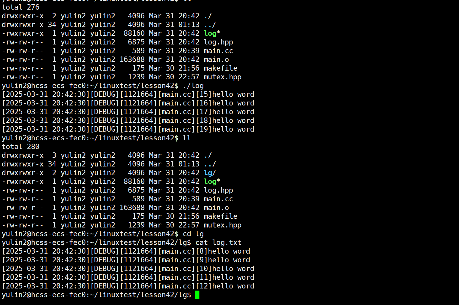 在构造函数中无论是使用默认值函数外部提供的,都需要判断这个目录在不在,我们可以使用系统提供的mkdir函数,或者stat,我们这次使用C++17新的文件处理库,filesystem库,这个里面就可以判断一个文件目录在不在和创建一个文件目录。exits的返回值是bool,如果目录在就返回了,接着如果不存在就需要创建一个目录,使用create_directories可以创建一个自己传入的指定目录,用try包裹起来,catch捕获错误信息,filesystem_error会存储所有调用fileststem库函数中的错误,e.what()打印错误,接着重写synclog方法,有路径了,写入文件的方式有很多,但是我们这里直接使用文件输出流ofstream ,ofstream是 C++ 标准库中的一个类,用于将数据写入文件(文件输出流,Output File Stream )。它属于 <fstream> 头文件,是 std::ostream 的子类,提供了文件操作的功能。关键在于 "输入(Input)" 和 "输出(Output)" 是相对于程序而言的 ,而不是相对于用户或文件。ofstream(Output File Stream) :程序 输出 数据到文件(程序 → 文件)。