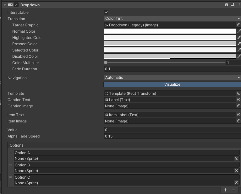 | Template 模板 | 下拉列表的模板的 Rect Transform。 |