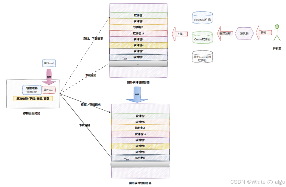 yum和apt是一个包管理器,就相当于我们手机上的应用商店,开发者将软件打包好放在一个服务器上,我们通过yum/apt就可以很方便获取到这个编译好的软件,直接进行安装,不需要考虑软件依赖关系