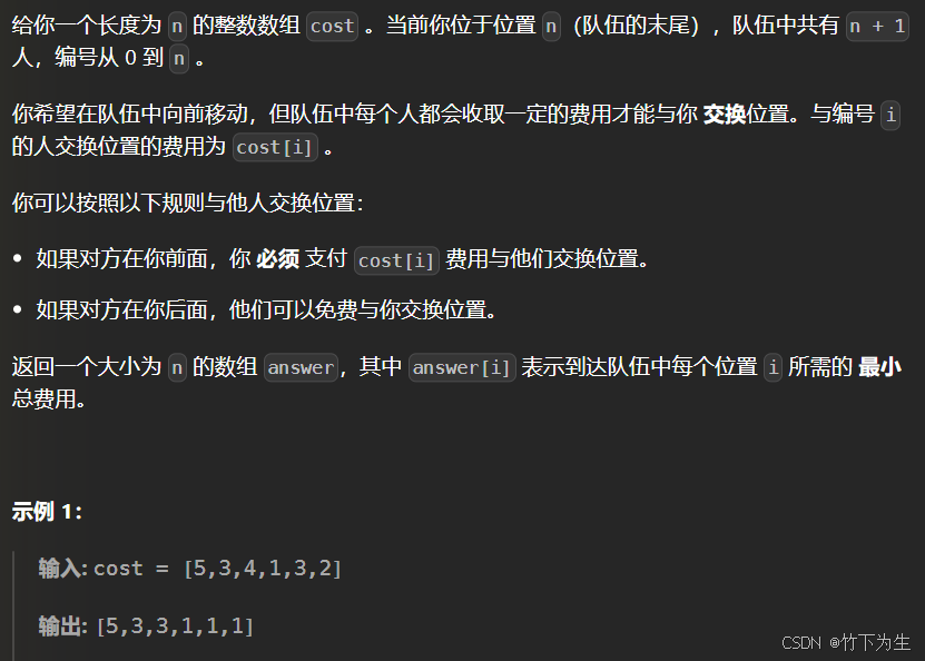 题目要求返回从队尾到达任意位置的最小费用,规则:如果下标 i i i 在前面,则与 i i i 交换位置需要 c o s t [ i ] cost[i] cost[i],如果如果下标 i i i 在后面,交换位置不用支付费用。