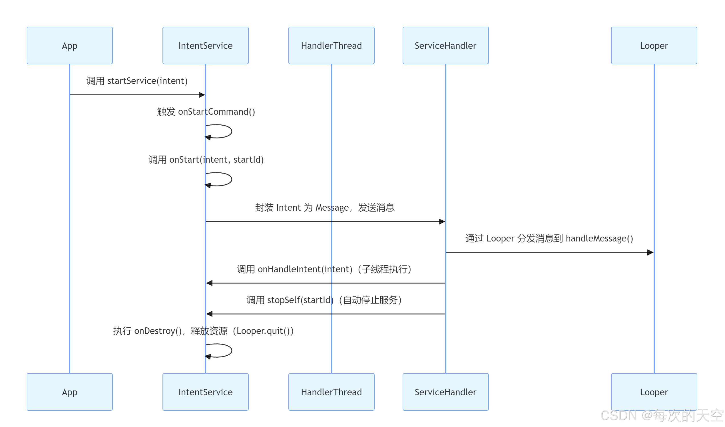 onCreate():创建一个HandlerThread并启动它,然后获取该线程的Looper,创建一个ServiceHandler并关联该Looper。onStartCommand():调用onStart()方法,将传递的Intent封装成Message发送给ServiceHandler。ServiceHandler的handleMessage():调用onHandleIntent()方法处理Intent,处理完成后调用stopSelf()停止服务。
