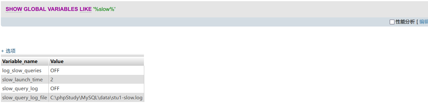 set global slow_query_log_file='C:\\phpStudy\\WWW\\test.php' # 慢日志的路径【注意:一定要用双反斜杠】
