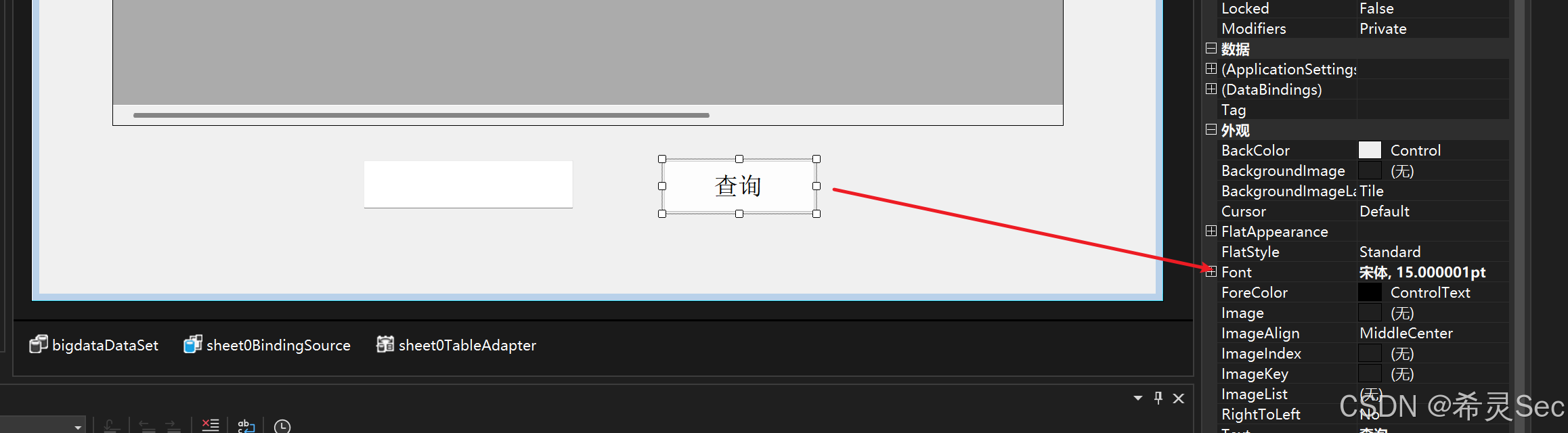 选择Button控件,在它的属性里修改其显示文本Text修改为:查询