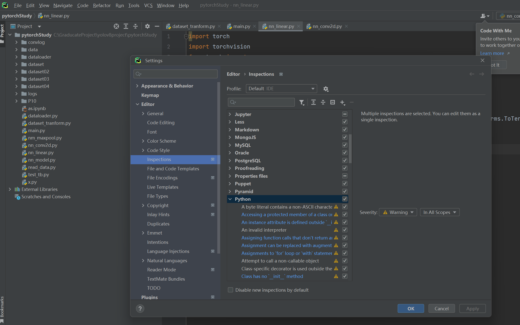 找到file->settings->editor->inspections 把python勾选上,原来不能用是因为只勾选了一部分。