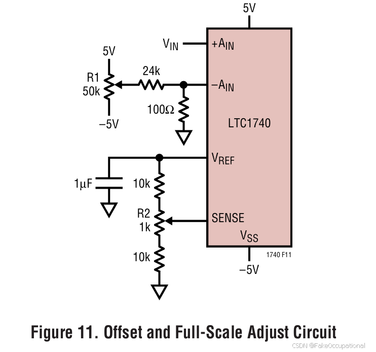 在需要绝对精度的应用中,可以将偏移误差和满量程误差调整为零。调整时应先调整偏移误差,再调整满量程误差。图11展示了一种针对双电源、5.00V输入范围应用的误差调整方法。