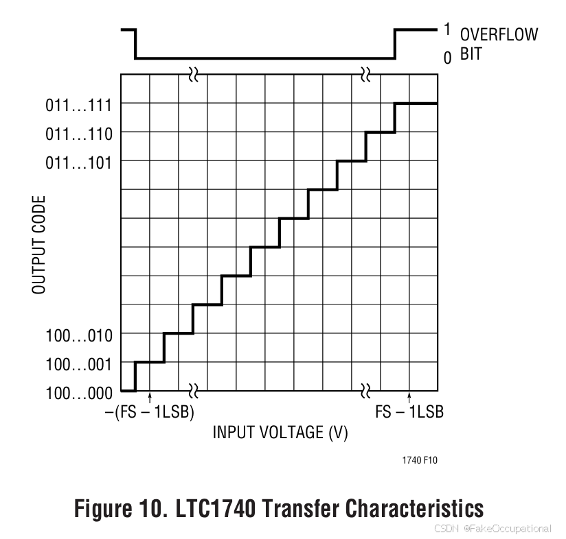 - 图10展示了LTC1740的理想输入与输出关系。输出数据范围位从10 0000 0000 0000 到 01 1111 1111 1111。