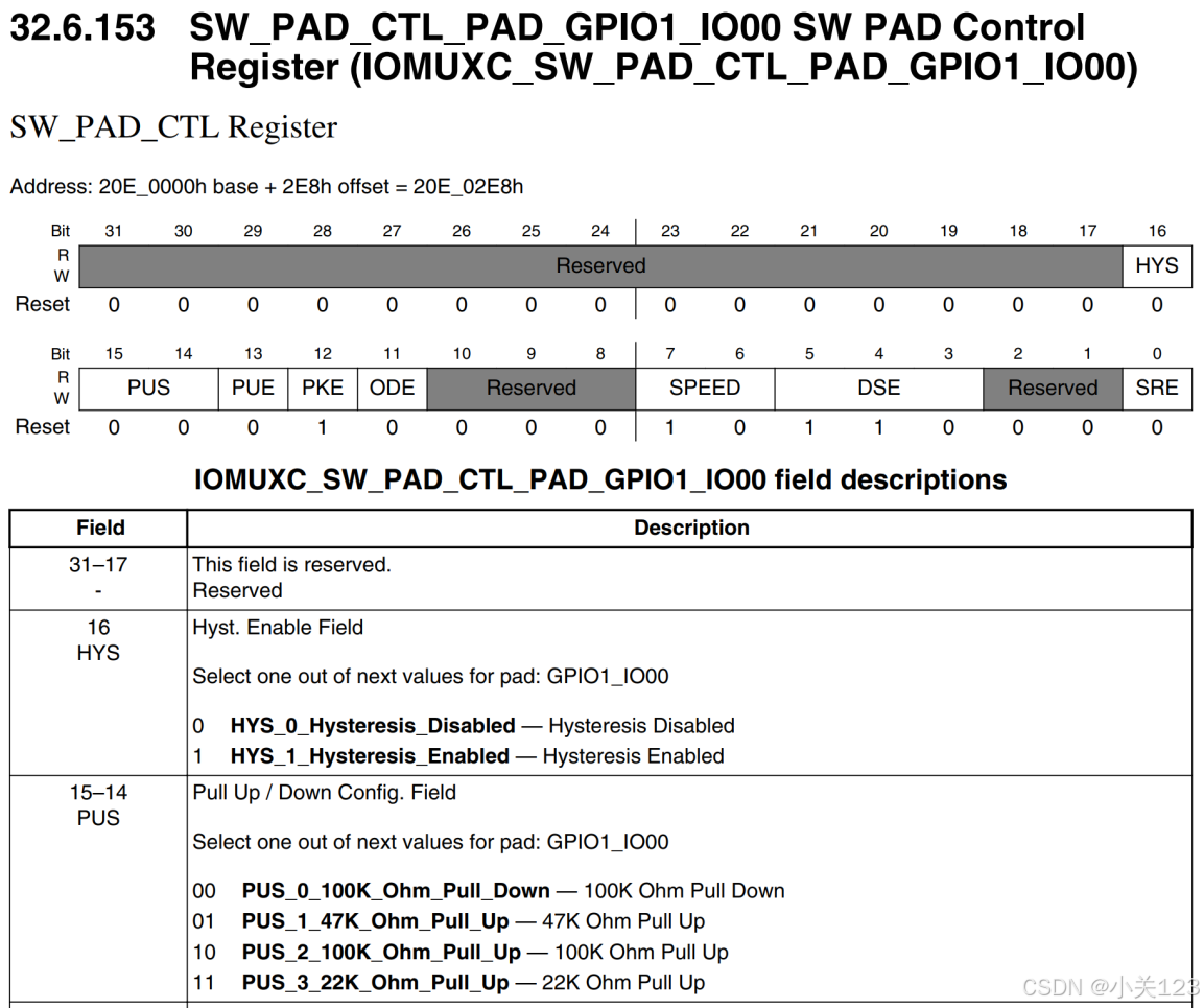 可以看出,IOMUXC_SW_PAD_CTL_PAD_GPIO1_IO00 也是个32 位寄存器,地址为 0X020E02E8。只用到了其中的低 17 位