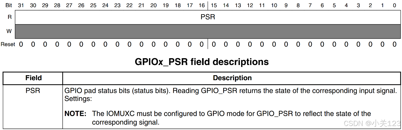 PSR 寄存器:状态寄存器PSR 寄存器也是一个 GPIO 对应一个位,读取相应的位即可获取对应的 GPIO 的状 态,也就是 GPIO 的高低电平值。功能和输入状态下的 DR 寄存器一样。