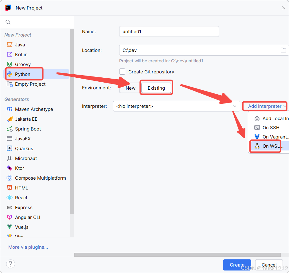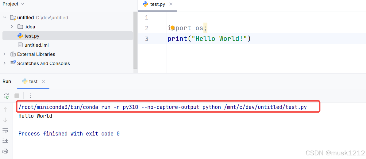 选择的对应的 conda 环境 ,这里的环境是 子系统 ubuntu 上,新建的项目会默认使用此conda环境