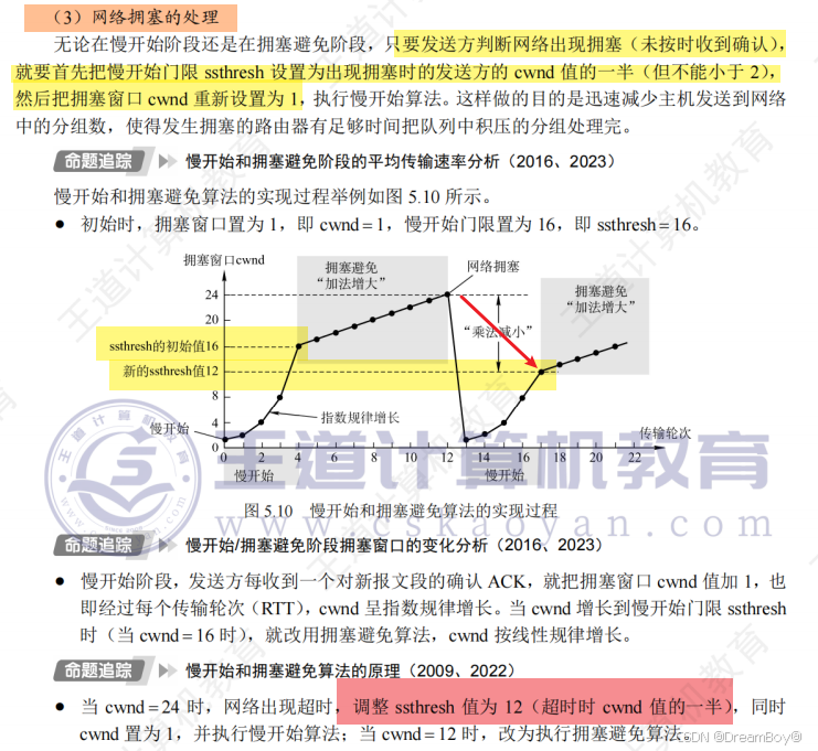 - 如已知 TCP 发送方窗口大小、接收方窗口大小以及当前已发送未确认的字节数,计算发送方还能发送多少字节;或者给定 TCP 拥塞控制的初始阈值、当前拥塞窗口大小,以及发生超时重传等情况,要求画出慢启动、拥塞避免、快恢复的窗口变化图,并说明每个阶段的窗口值。