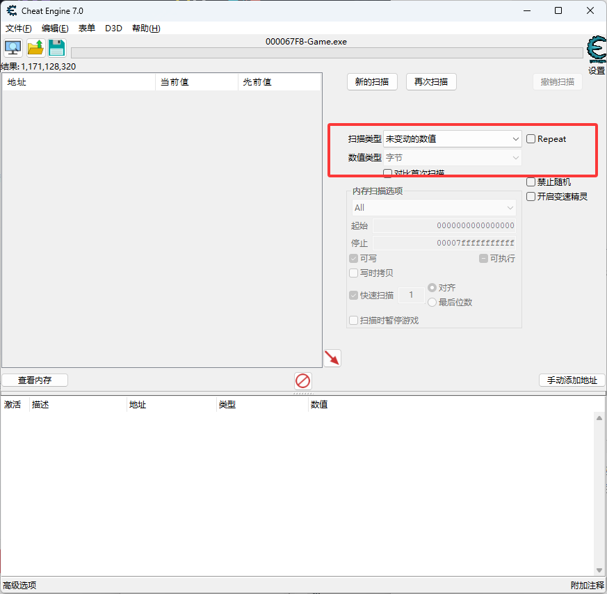首先打开游戏,打开CE,如下图,数据类型使用字节,扫描类型使用位置的初始值,字节的范围是0-255