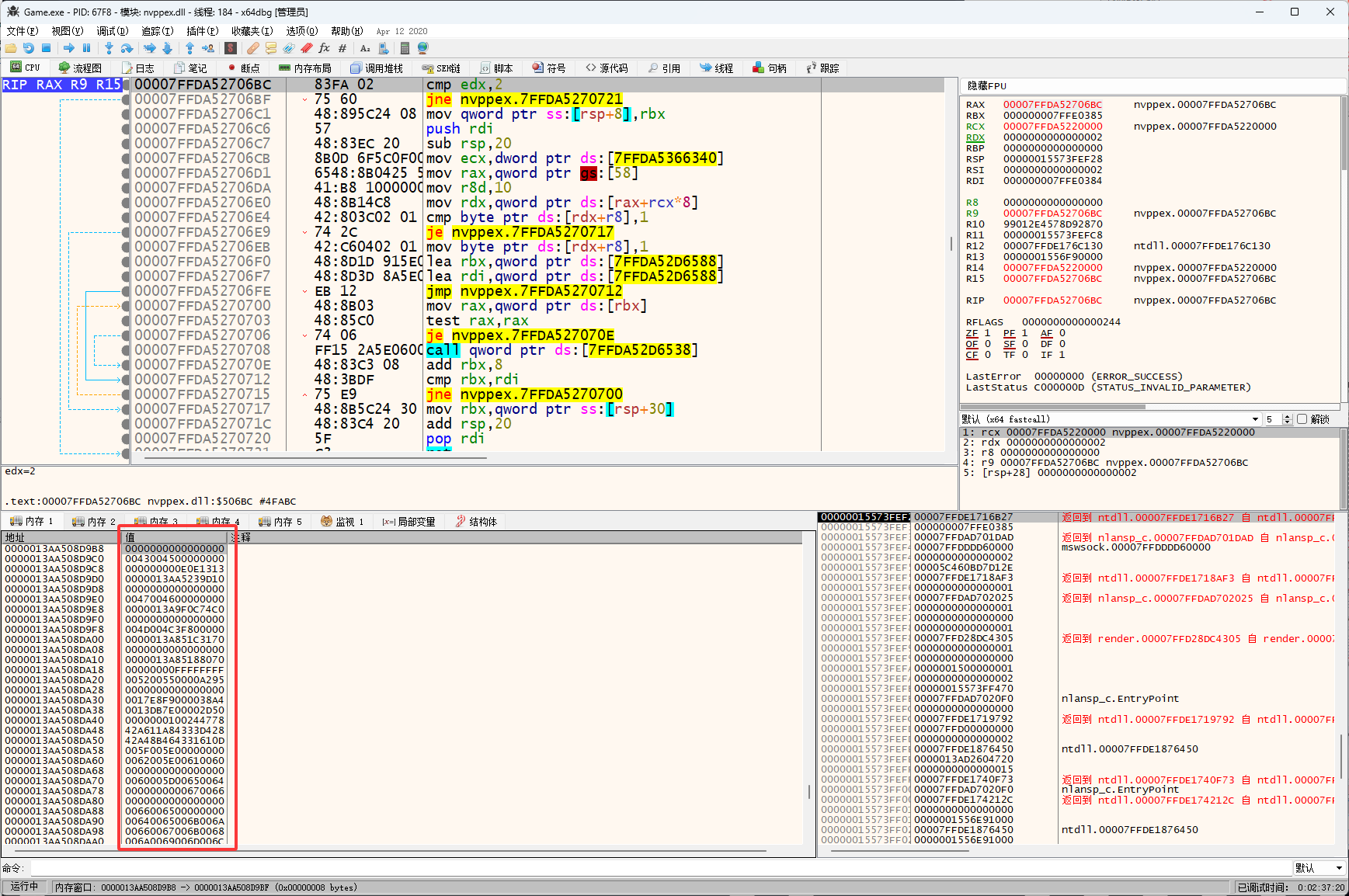 然后禁用硬件断点,禁用玩按F9让代码运行起来(代码长时间卡死不执行会让游戏掉线)