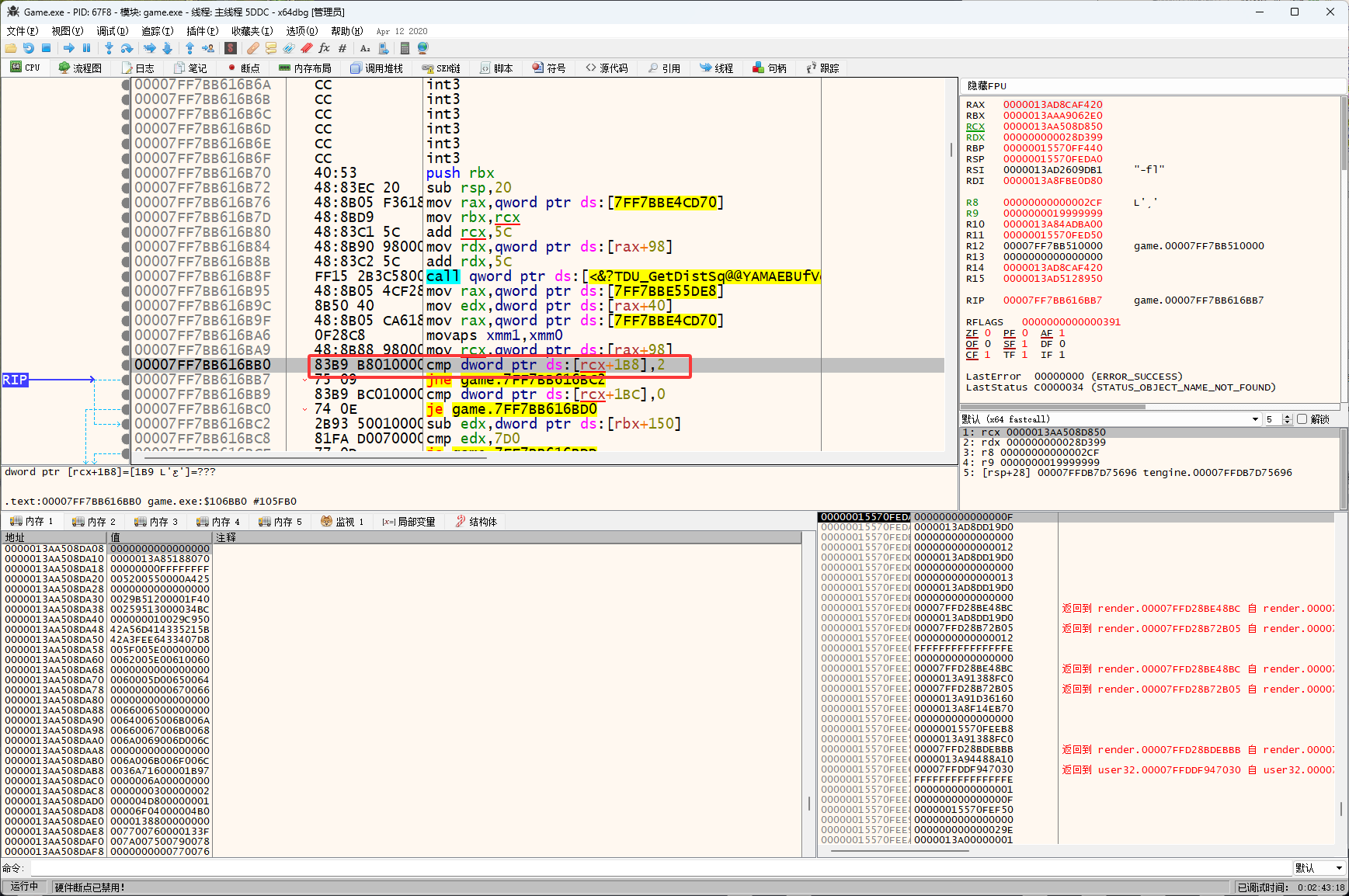 然后分析代码,人物状态是下图红框位置的代码访问的,也就是rcx+1B8访问的