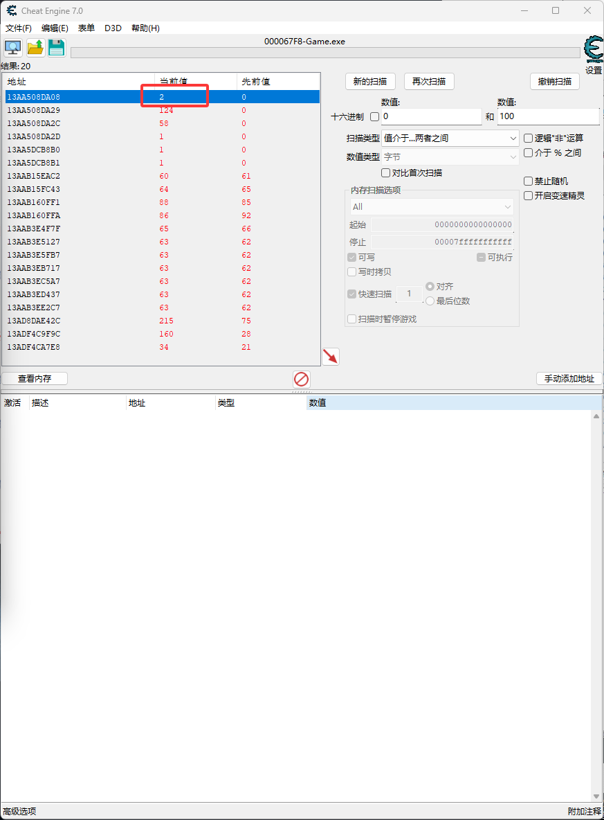 最开始说过人物状态期望的是0-50之间,这里直接用0-100进行筛选,如下图筛选玩还剩31个,这时候操作游戏修改人物状态观察数据