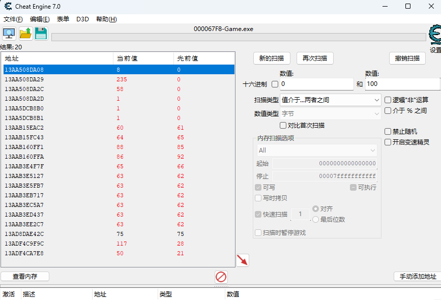 现在满足期望的是下图红框的这几个数据,因为它们的数字很小,然后回到游戏中继续修改人物状态观察数据