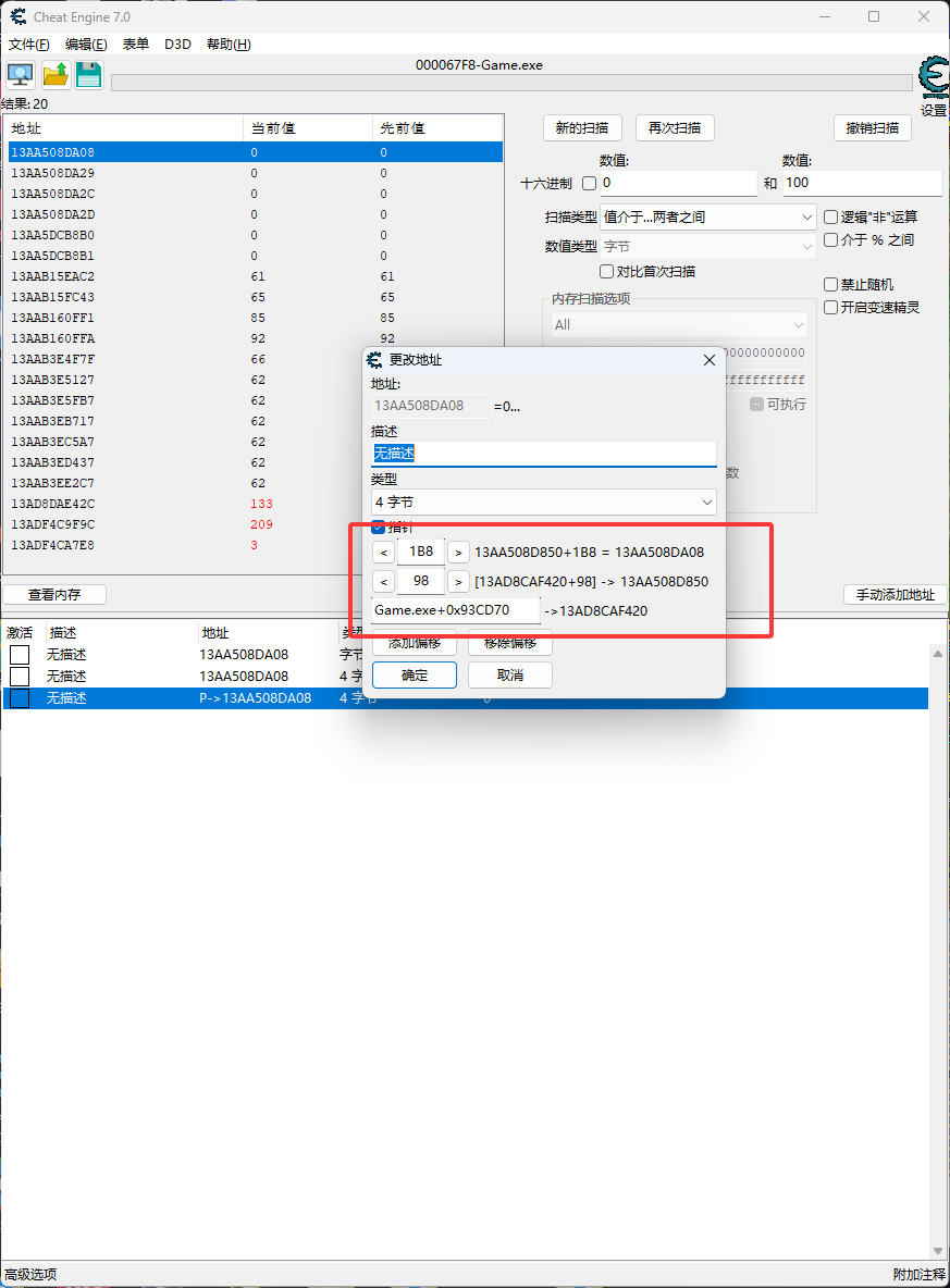 公式[[Game.exe+0x93CD70]+0x98]+0x1B8,在CE中进行验证