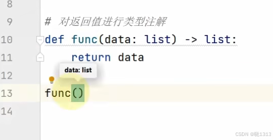 由图,引出类型注解。因为PyCharm无法通过代码确定应传入什么类型,因此我们需要"类型注解"。