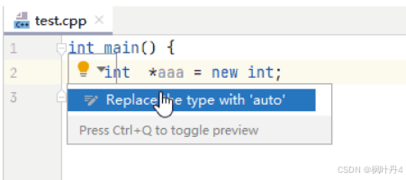 编辑器中可以用auto替换 iterator,new expression,cast expression的声明类型。光标悬浮在类型名称处,点击灯泡图标,在下拉菜单中选择Replace the type with 'auto **'**完成替换。