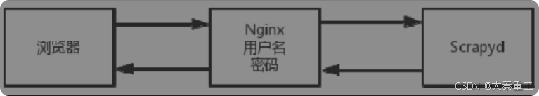 Nginx读作Engine X,是一个轻量级的高性能网络服务器、负载均衡器和反向代理。为了解决Scrapyd的问题,需要用Nginx做反向代理。所谓"反向代理",是相对于"正向代理"而言的。前面章节所用到的代理是正向代理。正向代理帮助请求者(爬虫)隐藏身份,爬虫通过代理访问服务器,服务器只能看到代理IP,看不到爬虫;反向代理帮助服务器隐藏身份。用户只知道服务器返回的内容,但不知道也不需要知道这个内容是在哪里生成的。使用Nginx反向代理到Scrapyd以后,Scrapyd本身只需要开通内网访问即可。用户访问Nginx, Nginx再访问Scrapyd,然后Scrapyd把结果返回给Nginx, Nginx再把结果返回给用户。这样只要在Nginx上设置登录密码,就可以间接实现Scrapyd的访问管控了,如图所示。