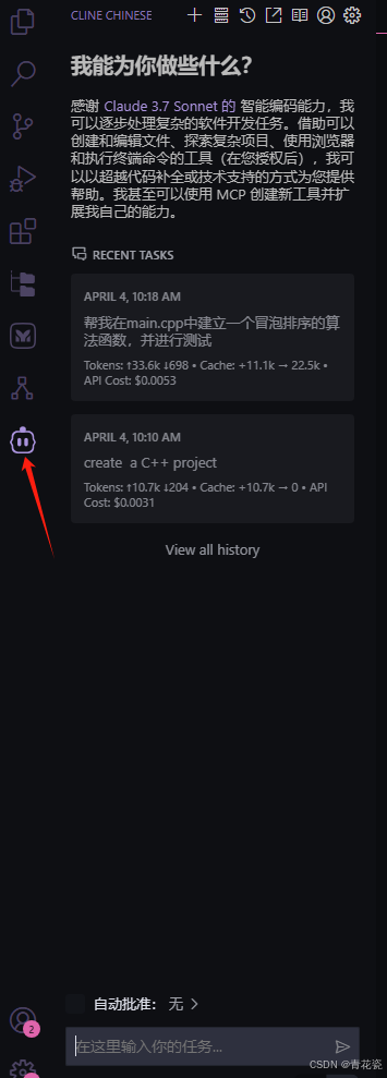 我有安装了Cline的中文版本插件,启动后的效果如下: