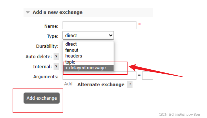 - 确认点2:如果创建新交换机时可以在type中看到x-delayed-message选项,那就说明插件安装好了