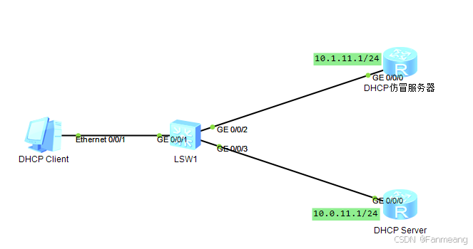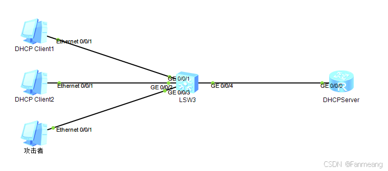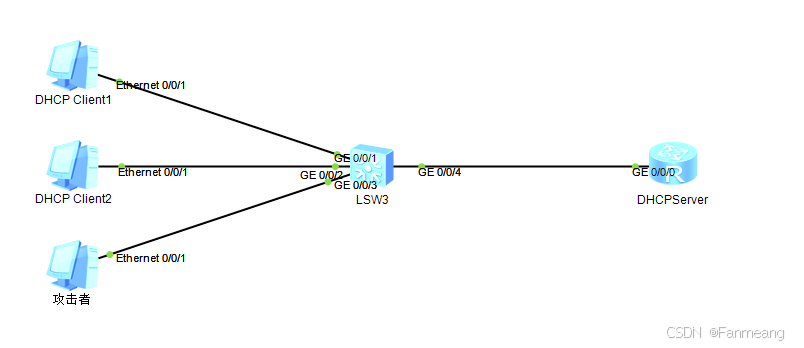 在这张拓扑当中攻击者会通过发送大量的请求报文来申请我们服务器的IP地址,导致我们服务器地址枯竭无法正常给合法用户分配IP地址