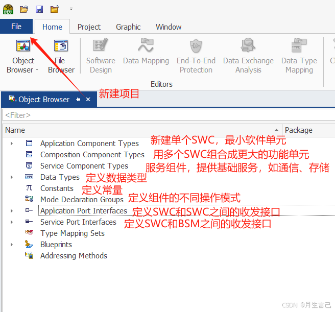 图形化建模:支持 SWC(Software Component)设计、接口定义、端口连接等。