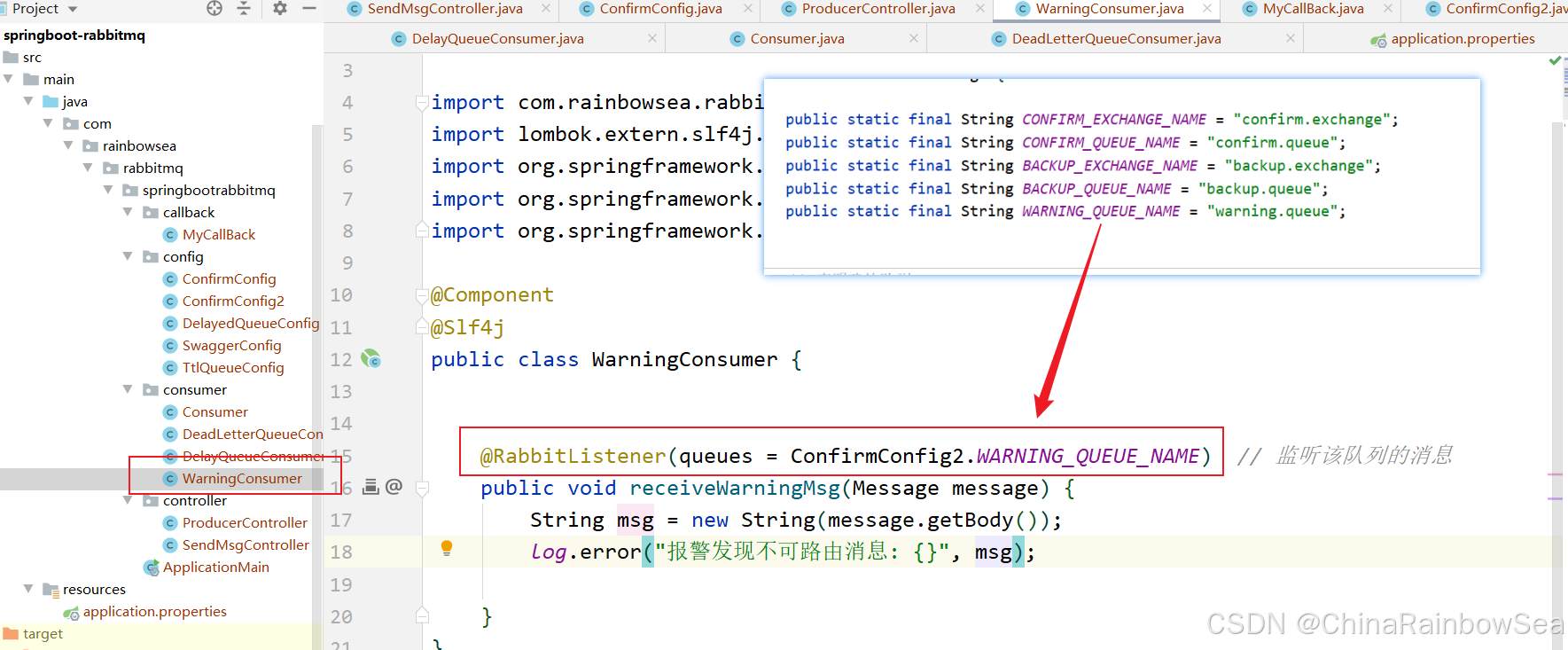 @RabbitListener(queues = ConfirmConfig2.WARNING_QUEUE_NAME) // 监听该队列的消息