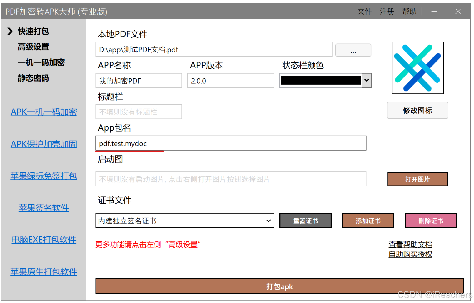 - 全部配置完成, 回到快速打包页面, 点击打包APK按钮, 即可把PDF文件转成APK文件