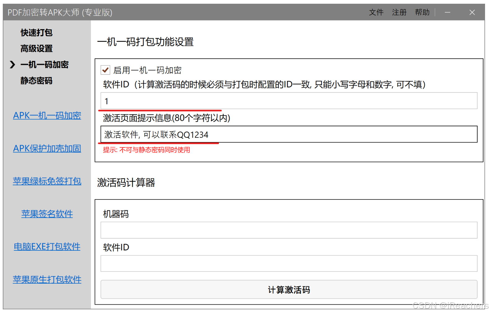 - 如果想要进行一机一码加密, 则可以左侧选择一机一码加密, 然后启用并配置一个软件id