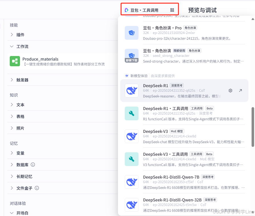扣子平台推出了各类行业领先的模型,其中有最先进的Deepseek R1模型,你尽可以从中挑选出最契合自身需求的那一款。