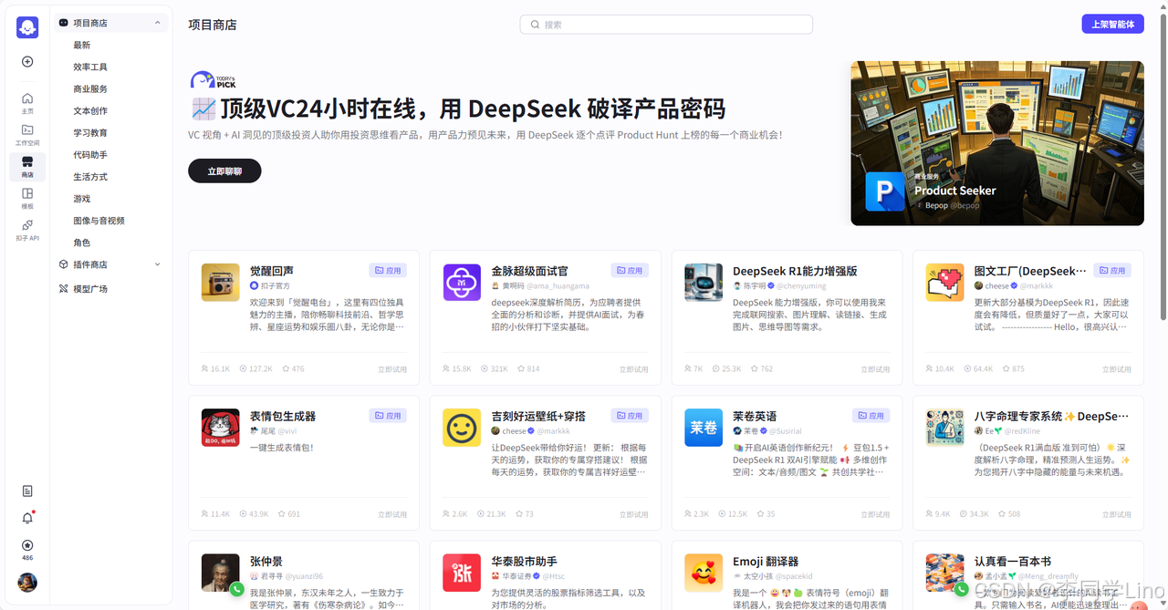 **商店是扣子 Coze 官方精心打造的 AI 应用体验殿堂。**在这里,开发者不仅能够亲身体验官方推出的智能体应用,还能探索其他开发者分享的精彩成果。同时,开发者也有机会将自己精心搭建的高品质应用发布至商店,以供其他用户参考和体验。