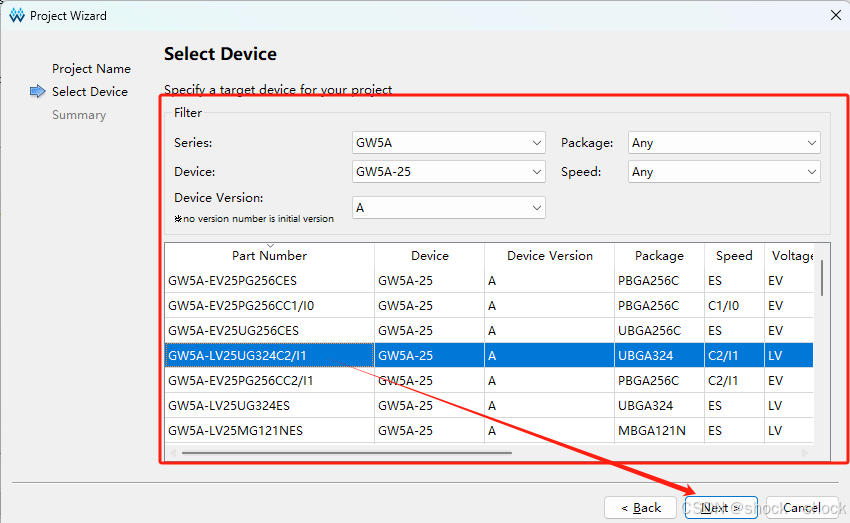 选择器件型号,由于本项目只是进行仿真,故大家可以跟着我使用相同的器件型号,也可根据自己的实际芯片来选择,确定后点击next