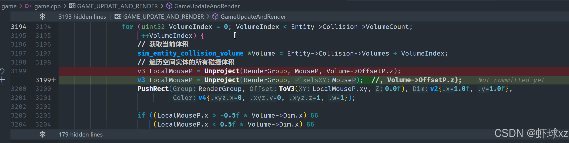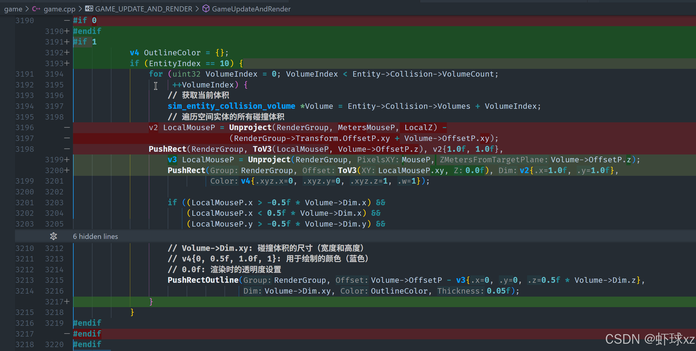 具体步骤是:先回到绘制轮廓的代码,确保每个实体的边界框都能被正确绘制出来。通过调用 PushRectOutline 来绘制每个实体的碰撞矩形。在此过程中,我们不再改变渲染组中的偏移量和缩放值,而是保持它们的原始状态,这样可以避免任何不必要的变动,确保轮廓与实体的位置一致。