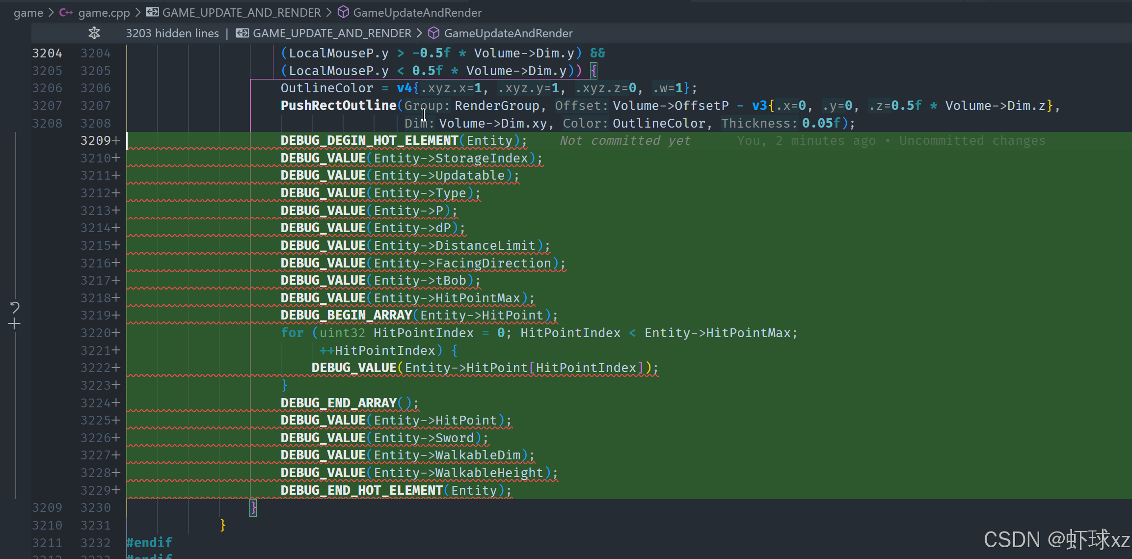 为此我们打算引入一种"热元素(hot element)"的调试机制,也就是说,在调试过程中临时记录下当前被选中的实体信息,并在之后统一渲染出来。我们会在代码中设置一个变量(如 DEBUG_DEGIN_HOT_ELEMENT),用来指向当前选中的实体指针或索引,然后在渲染流程中调用渲染逻辑,将其对应的调试信息打印出来。