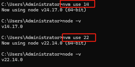 bashnvm use 14 node -v # 应显示14.17.0 nvm use 22 node -v # 应显示22.14.0