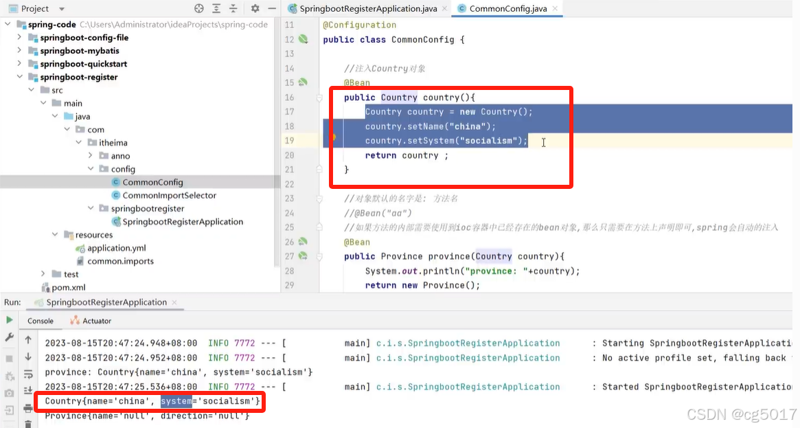 测试是否真的被注入,如下所示,真的在容器里找到了被注入的country对象。
