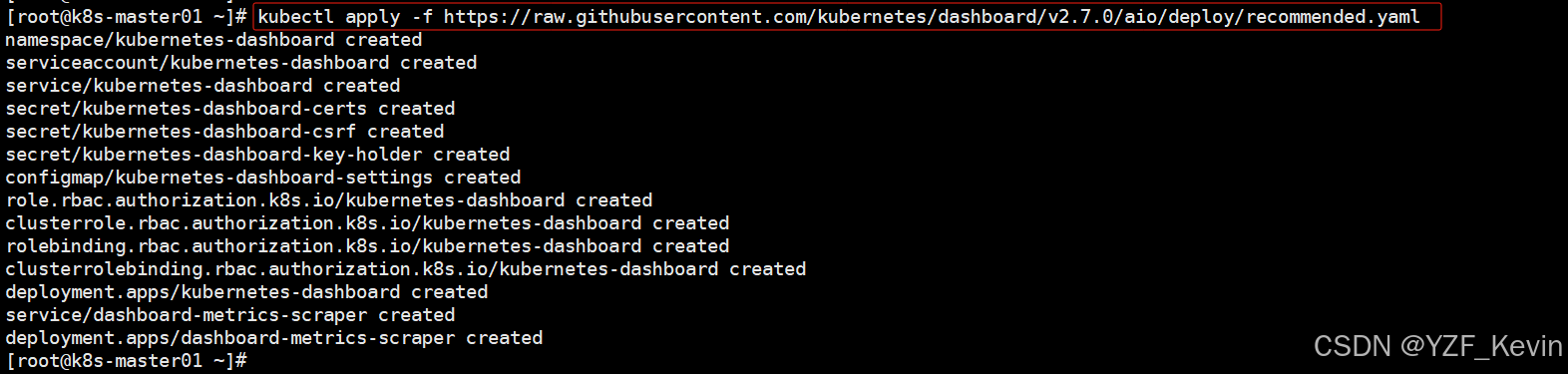 步骤一:下载dashboard的yaml文件并安装,命令 kubectl apply -f https://raw.githubusercontent.com/kubernetes/dashboard/v2.7.0/aio/deploy/recommended.yaml