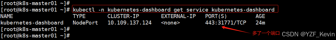 步骤三:查看dashboard的service, 命令 kubectl -n kubernetes-dashboard get service kubernetes-dashboard