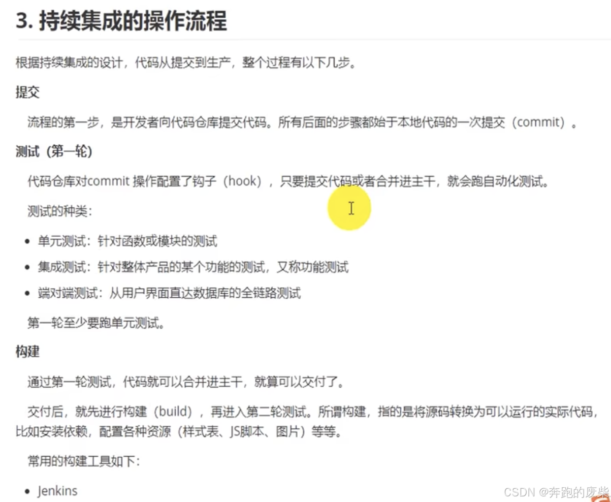 提交操作这件事发生后,就会触发自动化测试。构建,就是编译和安装各种资源。构建完了进行第二轮测试。