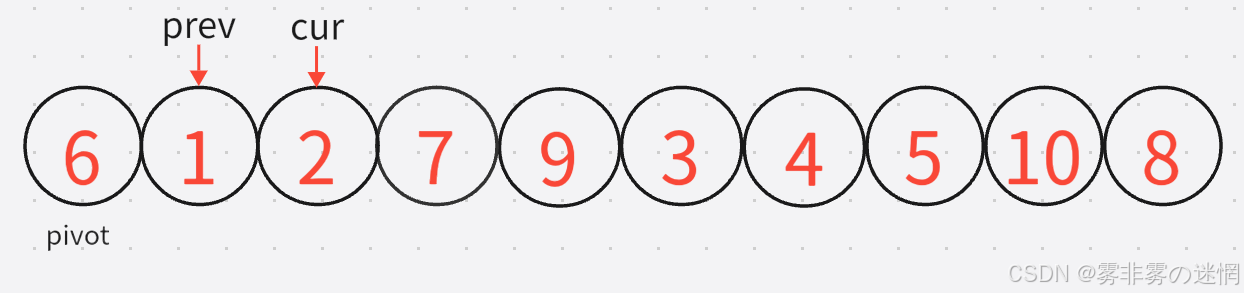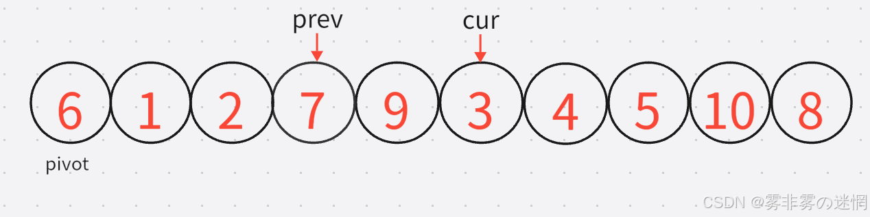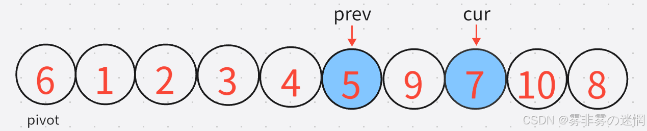 **3:**既然是前后指针法,cur 是要先动,cur 找到小之后,prev 再动,直到找到较大的元素:【注意:prev不能跑到cur的前面去】