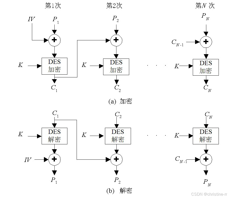 工作原理:在加密时,将前一个密文分组与当前明文分组进行异或操作后再进行加密。第一个明文分组需要与一个初始向量(IV)进行异或操作。解密时,先对密文分组解密,然后再与前一个密文分组异或得到明文分组。