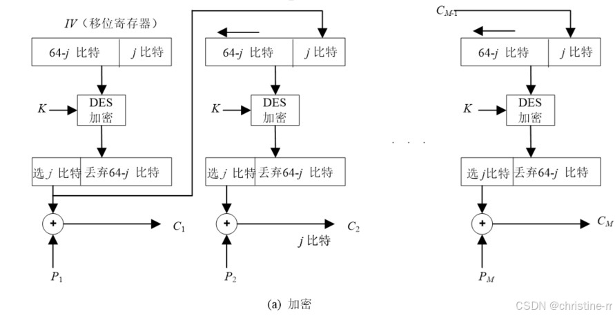 CFB加密时,加密算法的输入是64比特移位寄存器,其初值为某个初始向量IV。加密算法输出的最左(最高有效位) 比特与明文的第一个单元 异或,产生出密文的第一个单元 ,并传送该单元。然后将移位寄存器的内容左移 位并将 送入移位寄存器最右边(最低有效位) 位。这一过程继续到明文的所有单元都被加密为止