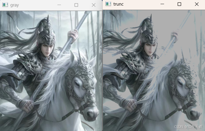 - 图中我们给的图片是一张赵云的图片,下图所示是原图与截断阈值化的图片对比: